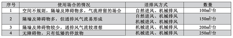 所需誘導風機的臺數,在考慮通風方式(機械送排風,自然進風機械排風),有無隔墻,空間形狀的前提下,技每臺誘導風機所要承擔的面積計算,可參照下表確定: