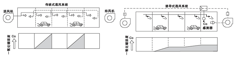 噴流誘導系統可設計智能系統,在誘導空間內設置空氣質量傳感器,用以探測一氧化碳濃度,通過控制器自動控制誘導風機的開啟與停止(配置智能誘導風機),以實現自動化控制。